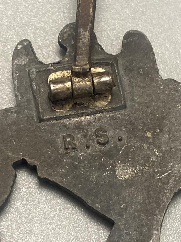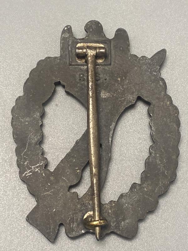 Original Maker marked Infantry assault badge in silver maker marked R.S. Rudolf Souval. A nice example complete with the pin, hinge and hook set up typical of this variant by this maker.