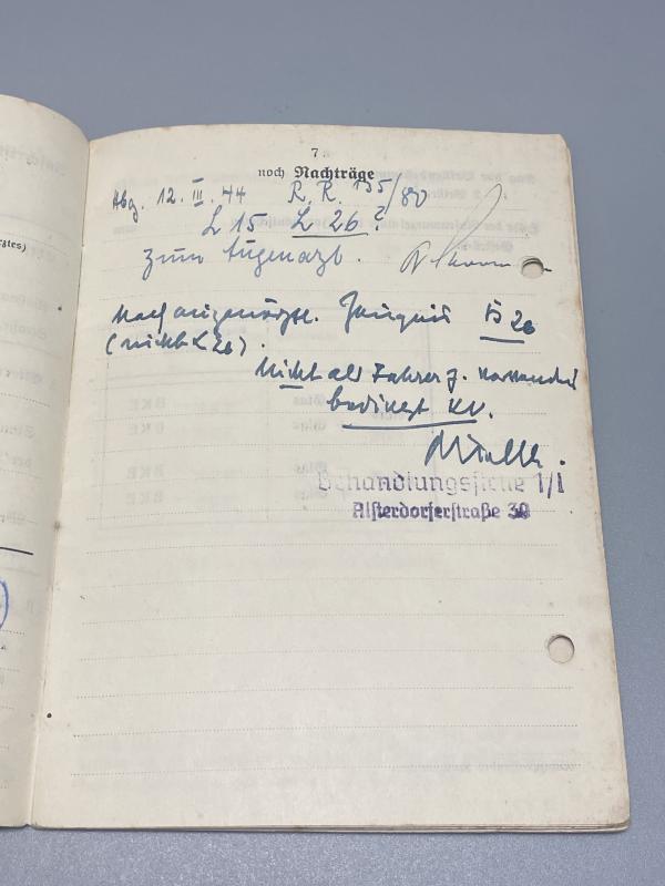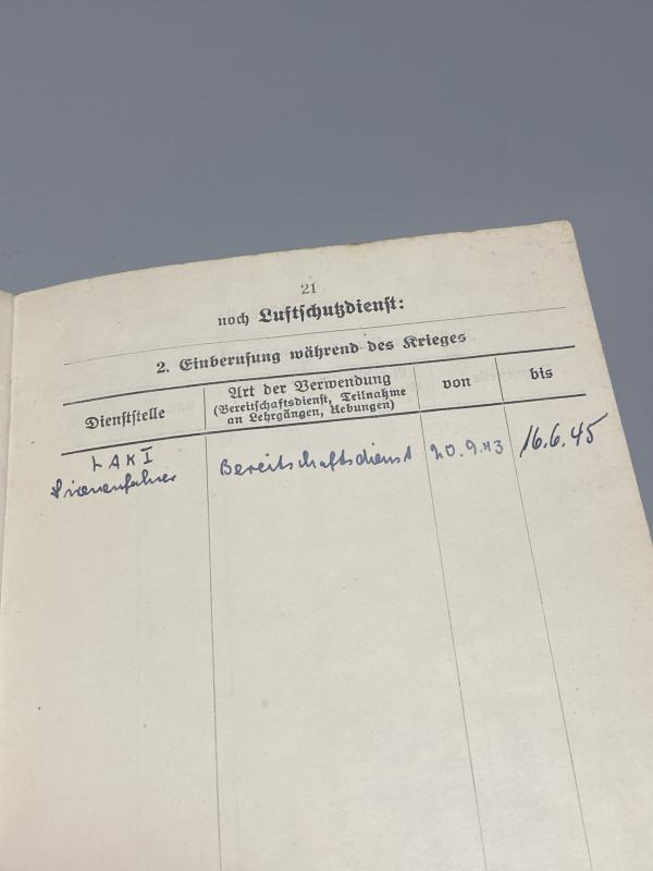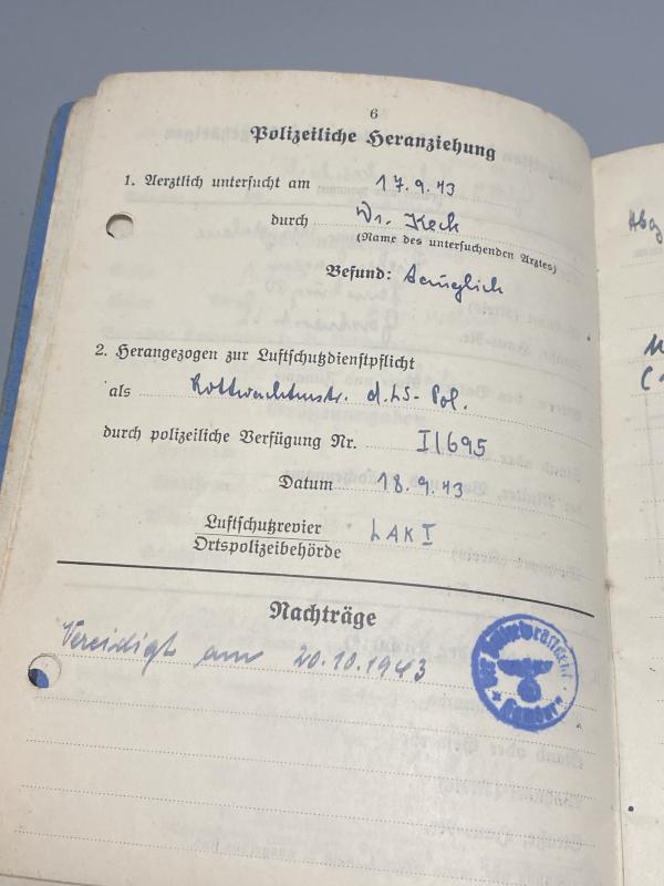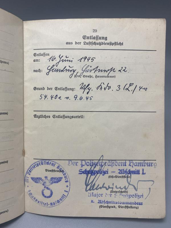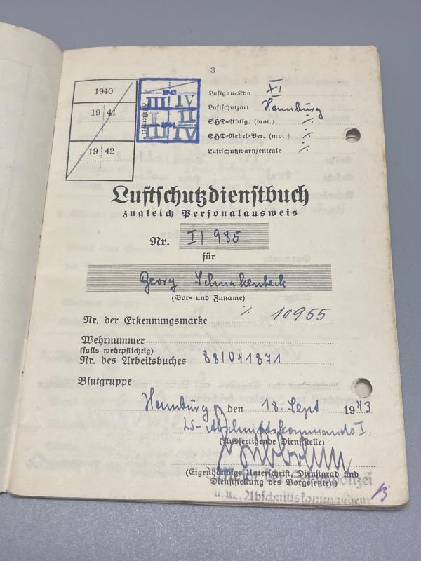 Original Luftschutz members work book for a member based in Hamburg. Some entries present inside.