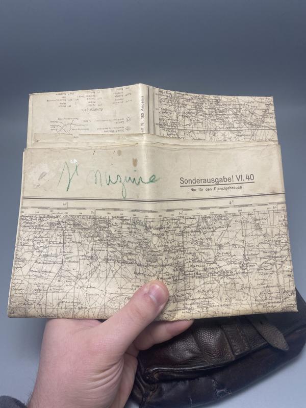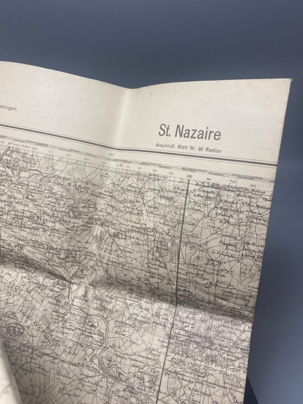 Original German Army/ airforce map case in brown lather dated 1938. Well worn example which includes an original map of St.Nazaire and its northern boundaries. Found by a local collector likely relating to the St.Nazaire pocket from August 1944 until the end of the war. A nice original Normandy item!