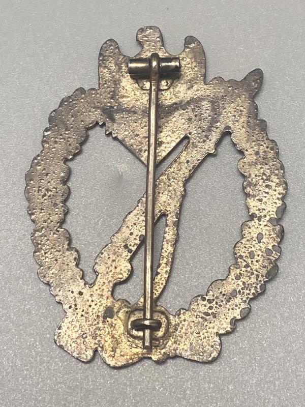 Original German army silver infantry assault badge manufactured by an unknown maker. A lot of original finish remaining. A nice early example.