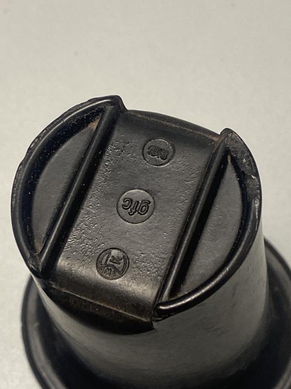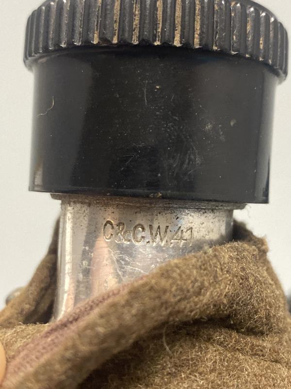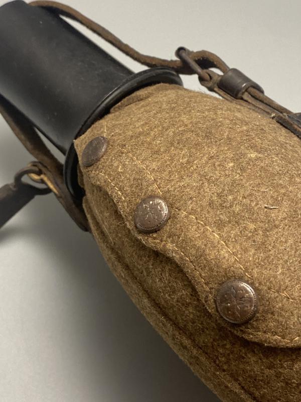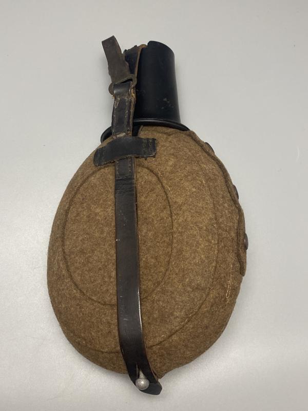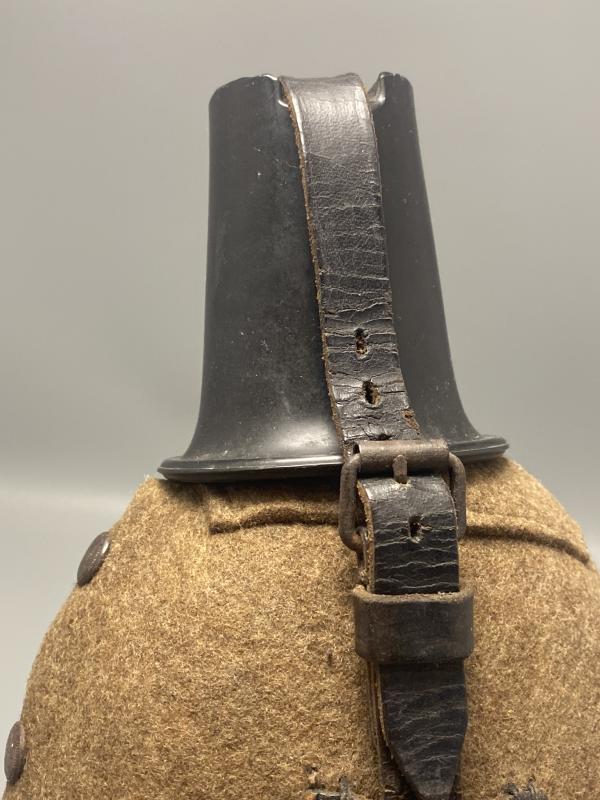 Original German army water bottle with full felt cover and leather hardware. Bakerlite cup dated 1943. Bottle marked 1941. Nice original piece in good condition.