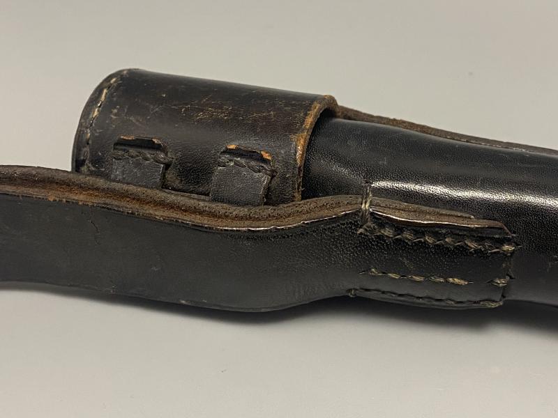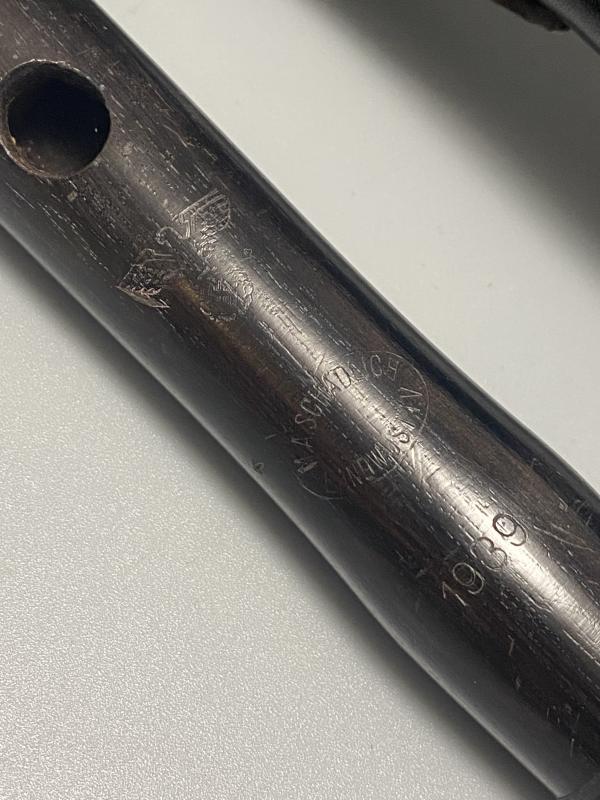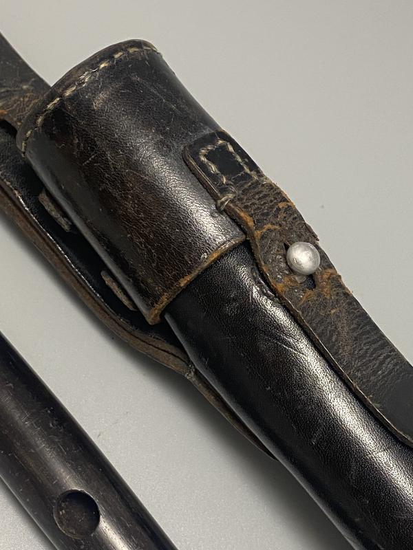 Original German Bandsman’s flute with its accompanying case. Flute is in good condition dated 1939 with a third Reich eagle alongside the manufacturer name M.A.Schadlich. The case is also in very good condition complete with its buttoned cap. The case is maker marked Otto Sindel, Berlin 1938. Sindel had the majority of contracts manufacturing leatherwork for the bandsmen of all German armed forces. Overall a great set, seldom seen.