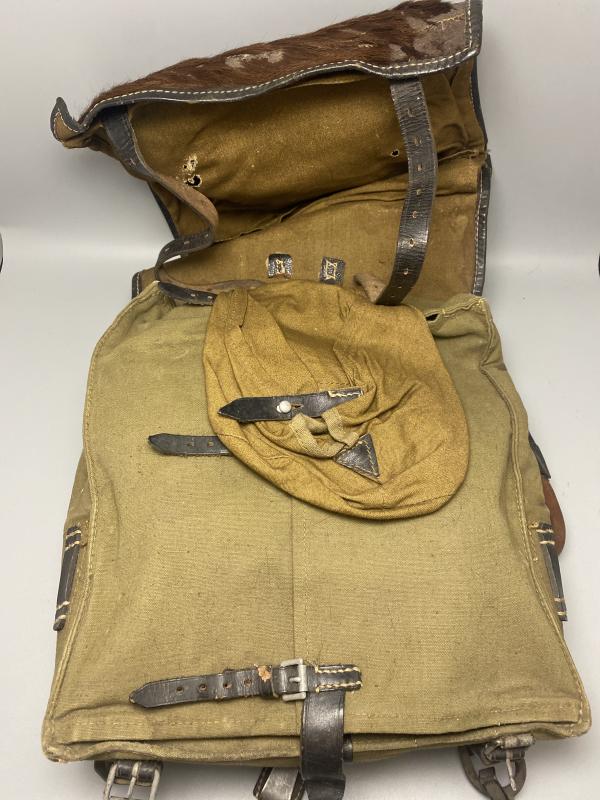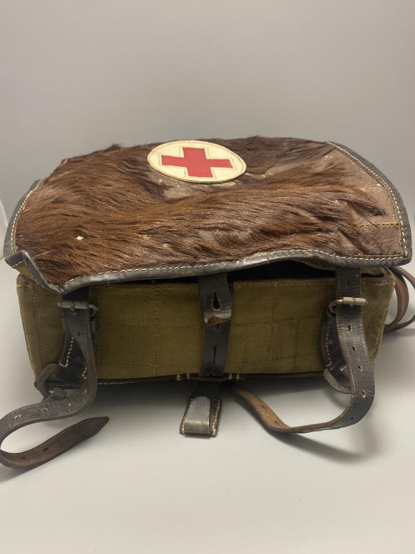 Original WW2 Rare German army medical tornister. Marked with the maker and date 1940 followed by a WaA inspection mark. Correct machine sewn roundel with Red Cross on the fur. Tornister differs very little from the regulars having an additional belt hook on the reverse which we haven’t spotted on any of our normal types. Some fur missing from the front however a great example of an early Medical tornister. Complete with all the relevant straps.
